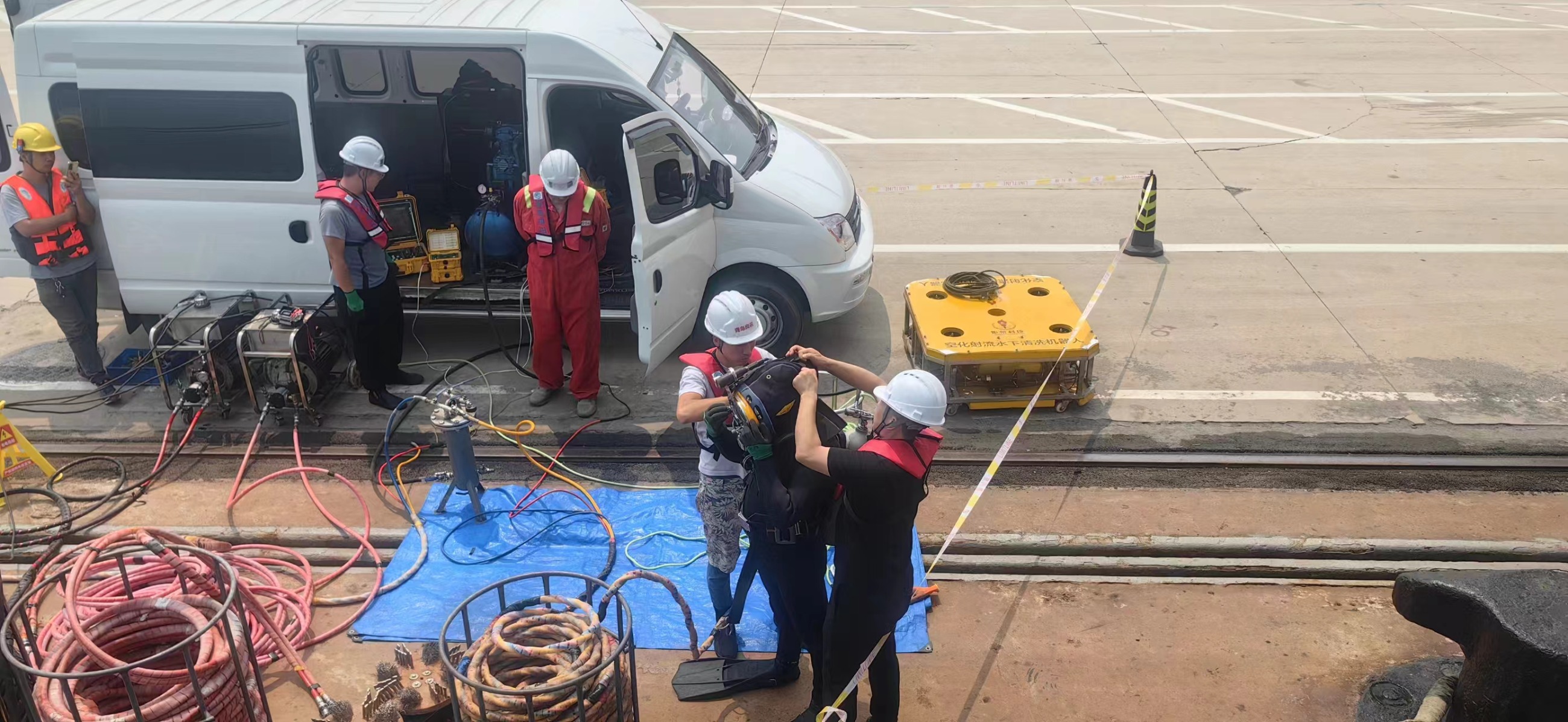 空化射流水下清洗機(jī)器人在港口進(jìn)行船體水下清洗項(xiàng)目。